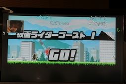 「仮面ライダーゴースト」コラボステージのデモプレイも披露された。プレイヤーキャラクターがチャリではなくバイクに乗っているので,プレイフィールが異なるという