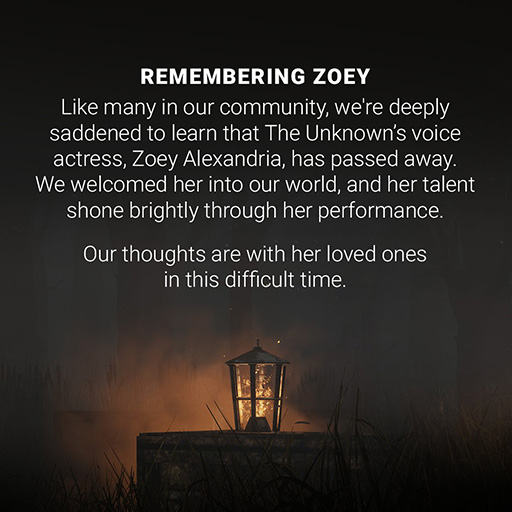 コミュニティの多くの皆さんと同じように、私たちはアンノウンのボイスをご担当いただいたZoey Alexandriaさんがお亡くなりになったとの報に接し、深い悲しみに堪えません。