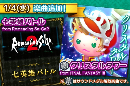 「シアトリズム FFオールスターカーニバル」,「ロマサガ2」「FFIII」の楽曲が追加。第2回のルクスクリスタルバトルも