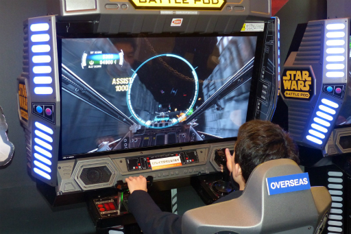 フラットスクリーン・エディションは,ドーム型の筐体で提供されたスター・ウォーズ:バトル ポッドのゲーム内容を,LCDフラットスクリーンを採用した小型筐体で提供するというものだ。映像を投影することで表示していたドーム型筐体のそれと比べ,同じゲームの映像をより鮮明な解像度で楽しめるようになっている。
