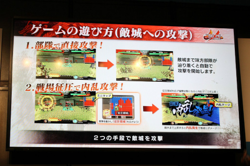 また,最新作では戦場を走り回ることで,画面のミニマップの色を塗り替えていく「制圧」の要素が追加されている。戦場をより多く塗りつぶすことで「内乱ゲージ」が上昇し,これがいっぱいになると敵城に内乱が発生してダメージを与えられる。直接,城を攻撃しなくてもいいので,戦略上の選択肢が増えたと言えるだろう。