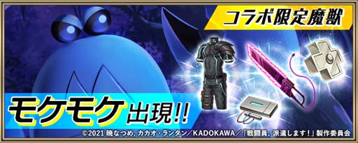 コラボ期間中、フィールドマップに登場する魔獣「モケモケ」を討伐すると、一定の確率でコラボ限定装備を生産するために必要な素材やカードを獲得できます。
