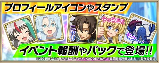 『戦闘員、派遣します!』のキャラクターたちにまつわる限定アイテムが続々登場!同盟メンバー同士のチャットがますます楽しくなるプロフィールアイコンやスタンプなど目白押しです。コラボ期間中の各種パックやイベント報酬などで入手できますので、ぜひチェックしてください。