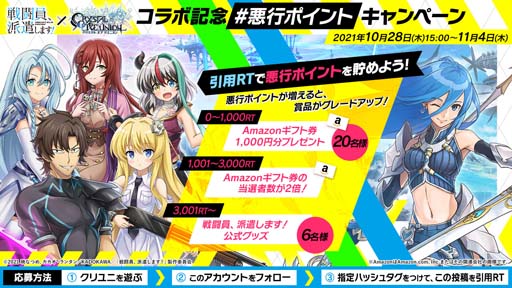 『戦闘員、派遣します!』とのコラボを記念し、豪華賞品が当たるTwitterキャンペーンを実施いたします。参加方法は『クリユニ』公式Twitter(https://twitter.com/CmCryuni)をフォローし、指定ハッシュタグをつけて対象ツイートを引用ツイートするだけ!ご応募いただいた方の中から抽選で20名様にAmazonギフト券(1,000円分)をプレゼントいたします。さらに、引用ツイートを行うごとに『悪行ポイント』が加算され、悪行ポイントが増えると賞品がグレードアップ!
