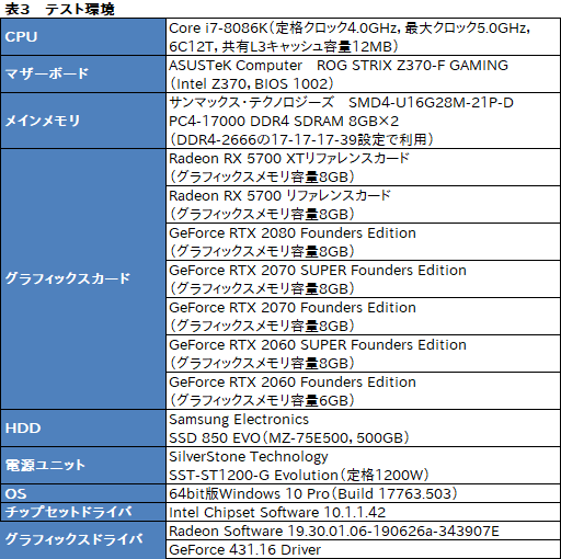 なお,RX 5700 XTとRX 5700のグラフィックスドライバには,全世界のレビュワー向けにテスト用として配布された「Radeon Software 19.30.01.06-190626a-343907E」を使用した。一方のGeForceシリーズは,RTX 2070 SUPERとRTX 2060 SUPERのテスト用としてレビュワー向けに配布された「GeForce 431.16 Driver」を用いている。そのほかのテスト環境は表3のとおり。