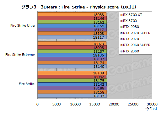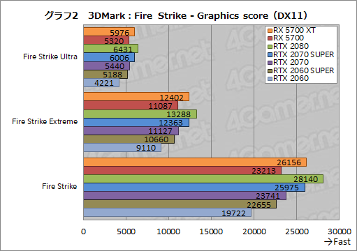 続いてグラフ2は,Fire Strikeの結果からGPU性能を見るGraphics scoreを抜き出したものだ。おおむね総合スコアを踏襲しており,RX 5700 XTのスコアは,RTX 2070 SUPERに勝ったり負けたりといったところ。一方のRX 5700は,RTX 2060 SUPERを上回るもの,RTX 2070には若干届かない。