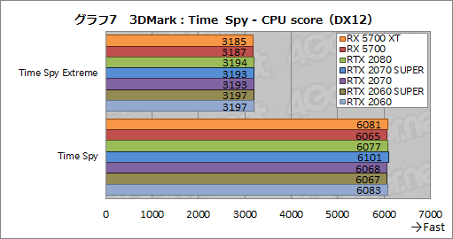 次にグラフ6はTime SpyからGPUテストの結果を,グラフ7はCPUテストの結果をそれぞれまとめたものだ。