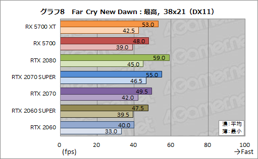 Far Cry New Dawnでも,RX 5700 XTは,平均フレームレートでRTX 2070を安定して上回り,RTX 2070 SUPERといい勝負を演じている。RX 5700も,RTX 2060 SUPERに対して肩を並べており,3DMarkのFire Strikeと似た傾向が得られている。