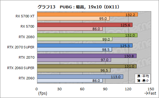グラフ11〜13にまとめた「PLAYERUNKNOWN'S BATTLEGROUNDS」(以下,PUBG)では,CPUのボトルネックによって,平均フレームレートが130fps付近でスコアが丸まりつつある。