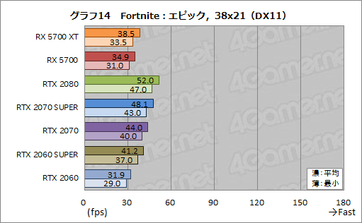 変わって,RX 5700 XTとRX 5700にとって苦しい戦いとなったのが,グラフ14〜16の「Fortnite」である。RX 5700 XTは,平均フレームレートでRTX 2060 SUPERにさえ7〜8%程度の差を付けられてしまった。RX 5700も,RTX 2060は上回ったものの,その差は2〜10%程度に過ぎない。このあたりは,AMDの最適化不足が指摘できよう。
