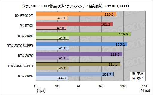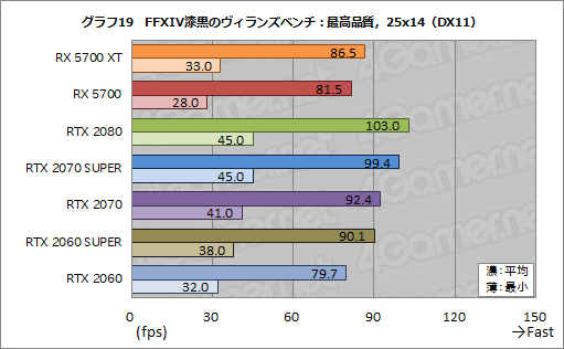 グラフ18〜19は,そんなFFXIV漆黒のヴィランズ ベンチにおける平均フレームレートと最小フレームレートをまとめたものだ。平均フレームレートは総合スコアを踏襲している一方で,最小フレームレートはCPU性能が色濃く表れており,GPUの性能差が見えにくい結果となった。