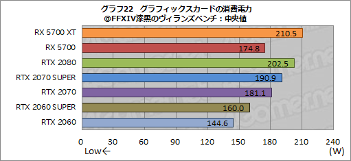 グラフ21は少々見にくいので,スコアの中央値をまとめたものがグラフ22だ。こちらでは,RX 5700 XTの消費電力は約210Wほどで,RTX 2080を若干上回ってしまった。一方,RX 5700の消費電力は,RTX 2060 SUPERより15W近く大きいものの,RTX 2070よりは低い。