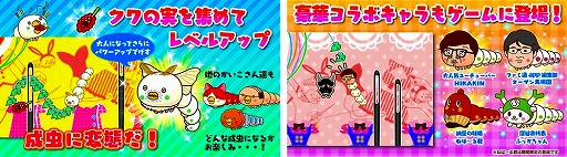 きもかわいいイモ虫「かいこさん」が主人公。リリース記念として人気YouTuberの「HIKAKIN」、人気ゆるきゃら「ねば〜る君」「ふっかちゃん」「ファミ通Appの馬場園」さんたちが、キャラクターコラボとして登場します