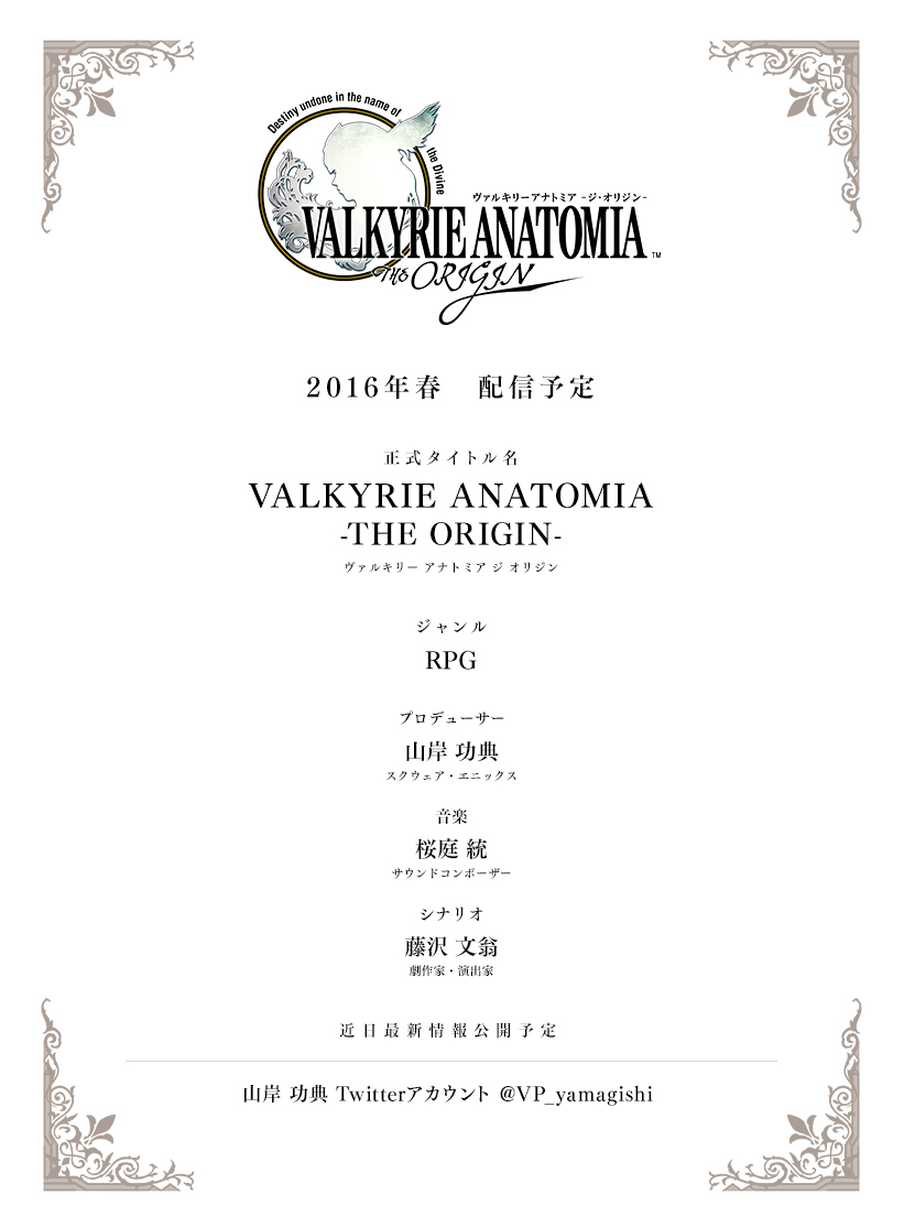 スクエニ,新作RPG「VALKYRIE ANATOMIA -THE ORIGIN-」を発表。山岸功典氏&桜庭 統氏コンビの最新作が2016年春に登場