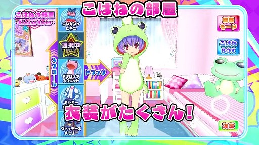 また今作では主人公こはねちゃんの着せ替えを楽しめる“こはねの部屋”を搭載。“こはねの部屋”では様々な衣装に着替えたこはねちゃんを、色々な角度で観察や撮影が可能。また衣装を着替えることで、ゲーム中の能力バロメーターが変化します。