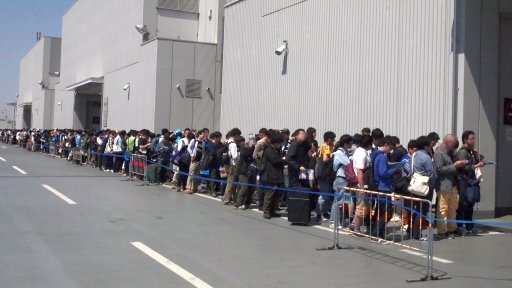 開場前の行列。先頭グループはかなり早い時間から並んでいたようだ。10:00の開場と共に,待機列の面々はお目当てのブースに早歩き(走るのは厳禁!)で向かっていった
