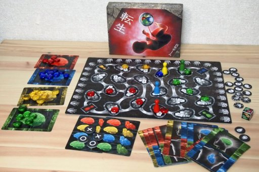 「転生」は,さまよえる2匹の霊が胎児として新たに生まれ変わる権利を賭けて戦う……という設定の2人用対戦ゲーム。プレイヤーはゲームボード上のコマを,すごろくのようにダイス目に応じて動かし,その通った道筋を,ダイス目に描かれた2つの色の,いずれかの色トークンで埋めていく。最終的に自分が担当する色(2色ある)のマスが最も多かったプレイヤーの勝ちなのだが,相手がどの色を担当しているのかは伏せられている。もちろん自分が担当する色も相手には分からないので,お互いの行動を見ながら,「あれ? もしかして相手は赤かな?」などと予測しなくてはならない,というわけだ。