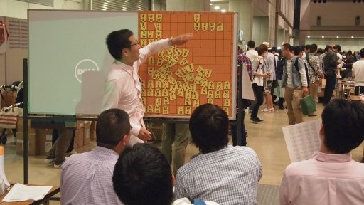 冨田哲也氏によれば,実際のプレイ時間は,大人同士で遊んだ場合,本将棋の倍の2時間くらい。また駒の数と種類が異なるほか,取った駒が使えないという違いがあるとのことだった。
