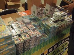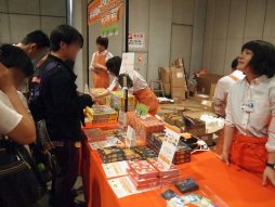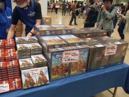 【ホビージャパン】箱ダメージ品の特価など,掘り出し物の多いホビージャパンブース。会場先行発売として,ビー玉を使った「ポーション・エクスプロージョン」,拡大再生産カードゲーム「オー・マイ・グーッズ!」,待望の日本語版「ロール・フォー・ザ・ギャラクシー」などが置かれていた。また商品重量が11キロ(!)あって3万8800円(税込)の「大いなる文明の曙」も,少数ながら持ちこんだそうだが即売り切れ |