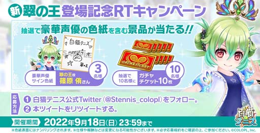 スマートフォン向け本格対戦テニスゲーム『白猫テニス』にて、9月12日(月)16:00より、白波翠の王(CV:篠原 侑)が「白波ガールズ~白波翠の王編~★5フェスガチャ」に新登場しております。また、これを記念して対象のツイートをRTすると、抽選で白波翠の王役の篠原侑さんのサイン色紙が3名に、ガチャチケット10枚が10名に当たるTwitterキャンペーンを開催しております。