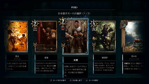 第1ラウンドの準備フェーズにデッキから引いた10枚が最初の手札となる。カードゲームでは,カードを捨てて引き直すことを「マリガン」と呼び,オリジナル版ではマリガンで最大2枚のカードを一度だけ引き直せたが,本作では最大で3枚引き直せるように変更されている。