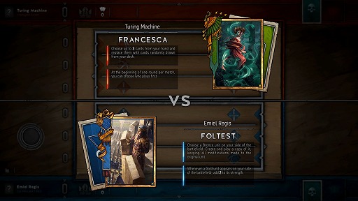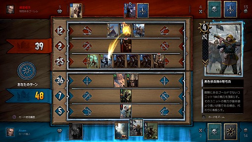 グウェントでは,デッキの強さで相手に劣っていてもプレイ次第で十分に勝利が可能だ。使えるカードの枚数が限られているため,相手に多くのカードを使わせたうえで“賢く”1ラウンド敗北し,残りのラウンドを確実にものにするといったスキル重視のプレイで,運の要素に左右されにくい対戦が楽しめる。