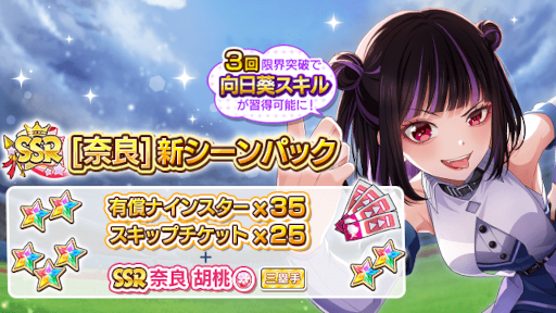 3回限界突破をすることで向日葵スキルを習得可能なSSR奈良胡桃がシーンパックに新登場いたします。