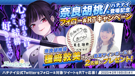 期間中、八月のシンデレラナイン公式Twitter公式アカウント(@hachinai89 https://twitter.com/hachinai89)をフォローし、ハッシュタグ「#ハチナイ_奈良胡桃登場」を含む公式ツイートをリツイートしてくださった方の中から、合計2名様に直筆サインボールをプレゼントいたします。