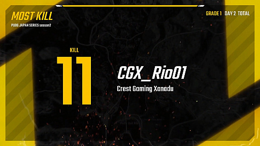 Day2のモストキルはCrest Gaming XanaduのRio01選手。V3 FOXのpoly選手も同キル数だが,その日の最終ROUNDの順位が高い方が優先される。両選手とも素晴らしい活躍ぶりだった
