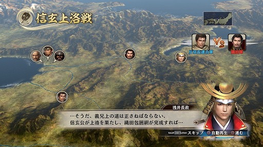 幸村の戦いは,戦国無双シリーズでお馴染みのタクティカルアクション(上段)。戦況は大河ドラマにも提供された「フル3D全国一枚マップ」(下段)で表現される