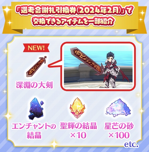 昨年に引き続き、冒険者の投票で観光大使を決めるイベント「2024年ミッドガルド観光大使選考会」を開催いたします。投票すると得られる「選考会謝礼引換券(2024年2月)」をためると、深淵の騎士が持つ剣をモチーフにした新武器外観装備「深淵の大剣」(種別:剣)などと交換できます。