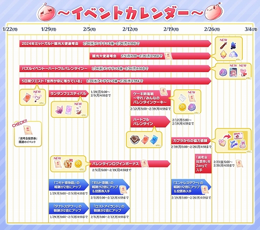 また、パズルイベント「ハートフルバレンタイン」では新しいカードや尾装備「ラブラブバルーン」を、5日間クエスト「世界が恋に落ちている」では新頭装備「恋心の矢」が獲得可能です。さらに、新尾装備「一家団欒」などをゲットできる「ランタンフェスティバル」など、さまざまなイベントを実施します。