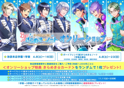 今回 2017 年 4 月 8 日(土)より、アニメイト池袋本店にて「ボーイフレンド(仮)きらめき☆ノート」特設コーナー「『ボーイフレンド(仮)きらめき☆ノート』オンリーショップ池袋本店学園 1 学期」、仙台・横浜・名古屋・天王寺・福岡天神にて「『ボーイフレンド(仮)きらめき☆ノート』オンリーショップ 1 学期応援店」をオープンいたします。「オンリーショップ」では、期間中にグッズの先行販売を行うほか、購入者限定の特典もご用意しております。また、7 月 1 日(土)より開催の 2 学期、11 月11 日(土)に開催の 3 学期すべてにお越しただいたお客様には、3 学期開催期間中に連動特典をプレゼントするキャンペーンも開催予定です。本「オンリーショップ」の最新情報は、「ボーイフレンド(仮)きらめき☆ノート」の公式 Twitter やゲーム内のお知らせにて告知いたします。