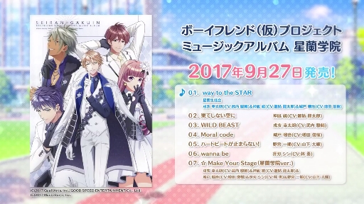 株式会社サイバーエージェント(本社:東京都渋谷区、代表取締役社長:藤田晋、東証一部上場:証券コード4751)が提供、スマートフォンゲームの企画・開発・運営に特化した株式会社QualiArts(本社:東京都渋谷区、代表取締役社長:辻岡義立)が運営・開発する学園青春リズムゲーム「ボーイフレンド(仮)きらめき☆ノート」(以下、「ボイきら」)は、キャラクターソングCD「ボーイフレンド(仮)プロジェクト ミュージックアルバム 藤城学園 #01」と「ボーイフレンド(仮)プロジェクト ミュージックアルバム 星蘭学院」の2枚を2017年9月27日(日)に同時発売することを決定いたしました。