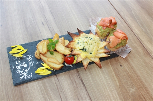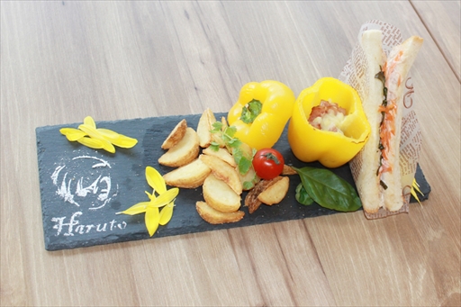 ハルトのツナマヨのサンドイッチは,ニンジンのシャキシャキ感に歯ごたえがあり,アネモネ風のパプリカに入ったミートローフもポイント。アオイのひまわりの花びらのような卵のキッシュはサクサクとした食感がたまらない一品だ。チアキはリコリス風のオニオンフライの甘みが印象的で,ハンバーグにオムライスとしっかり食べたい人も満足できる組み合わせとなっている。なお,ディッシュプレートはプラス300円で,スープとホットドリンクのセットに変更できる。
