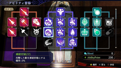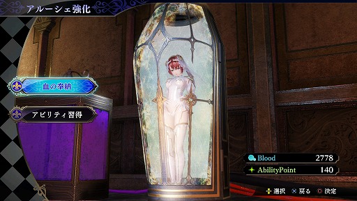 メンテナンスルームだろう。ここでは,邪妖を倒すときに浴びた蒼い血“Blood”を浄化することで,アルーシェがレベルアップしていく。レベルが上がるとHPやMP,ATKなどが上昇し,同時に“AbilityPoint”を獲得できる。このポイントを使って,ツリー構造になったアビリティから任意の能力を習得していく仕組みだ。