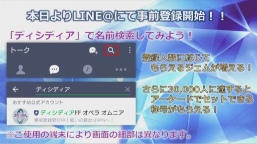 事前登録はLINEにて「ディシディア FF オペラ オムニア」のアカウントを登録することで行え,特典としてゲーム内で使える通貨