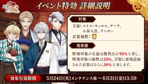 期間中「ルイス・キャロル」「ゲーテ」「小泉八雲」「ランボー」の衣装を編成して潜書すると、得点の獲得数がそれぞれ50%上昇します。また、「土」属性の衣装を編成して潜書すると、得点の獲得数がそれぞれ20%上昇します。