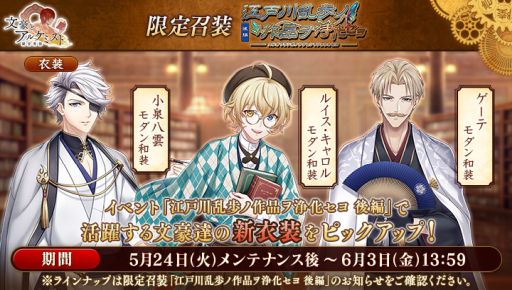 文豪の「衣装」や、会派に装備する事で能力を強化できる「装像」などが入手できるコンテンツ「召装」に、限定召装『江戸川乱歩ノ作品ヲ浄化セヨ 後編』が期間限定で登場します。この召装では、イベント『調査任務「江戸川乱歩ノ作品ヲ浄化セヨ 後編」』で活躍する「小泉八雲」「ルイス・キャロル」「ゲーテ」の新衣装を一定の確率で入手できます。