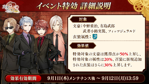 期間中「中野重治」「有島武郎」「武者小路実篤」「フィッツジェラルド」の衣装を編成して潜書すると、 得点の獲得数がそれぞれ50%上昇します。 また、 「水」属性の衣装を編成して潜書すると、 得点の獲得数がそれぞれ20%上昇します。
