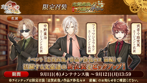 文豪の「衣装」や、 会派に装備する事で能力を強化できる「装像」などが入手できるコンテンツ「召装」に、 限定召装『志賀直哉ノ作品ヲ浄化セヨ 前編』が期間限定で登場します。 この召装では、 イベント『調査任務「志賀直哉ノ作品ヲ浄化セヨ 前編」』で活躍する「中野重治」「フィッツジェラルド」「武者小路実篤」の新衣装を一定の確率で入手できます。