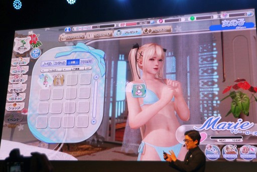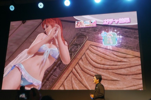 もちろん,「DEAD OR ALIVE Xtreme」シリーズのお約束通り,美少女達にいろいろな水着やアクセサリーを身に着けてもらえる。本作の水着やアクセサリーはガチャで入手可能だ。ガチャを回した際には「かすみがシャワーを浴びている姿が湯気の向こうに見え隠れする」という演出が入るのが男心をくすぐる。この日は「そのまま公開したのでは過激すぎる」ということで,急きょ自主規制を入れての実演となったが,それでもなまめかしい感じで,サービス開始後に見られる正式版が楽しみだ。