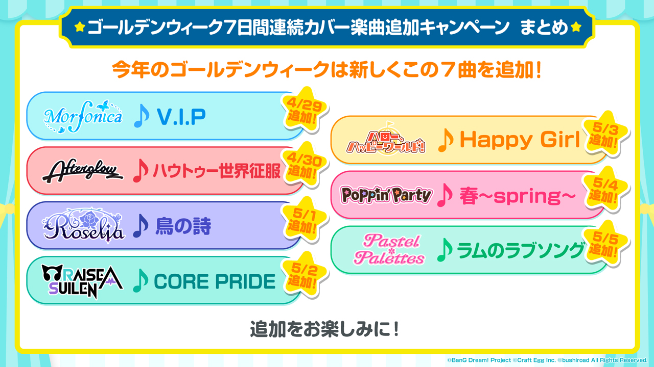 「バンドリ!」,4月29日15時から“ゴールデンウィーク7日間連続カバー楽曲追加キャンペーン”が開催