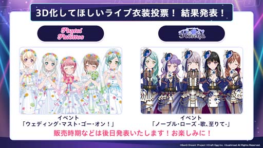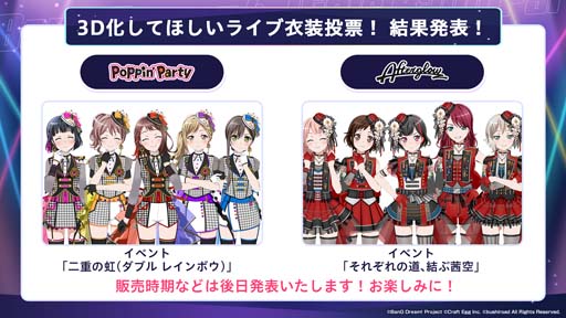 スマートフォンアプリの企画開発事業を展開する株式会社Craft Egg(本社:東京都渋谷区 代表取締役:森川 修一、以下、Craft Egg)と、株式会社ブシロード(本社:東京都中野区 代表取締役社長:木谷 高明、以下、ブシロード)の共同制作によるスマートフォン向けゲーム「バンドリ! ガールズバンドパーティ!」(以下、ガルパ)は、2023年3月19日(日)の「ガルパ特番 新情報発表ステージ!」にて、Poppin’PartyにHoneyWorksさんからの楽曲提供が決定したことや、「ホロライブ」所属タレントとのエクストラ楽曲の続報を発表いたしました。また、「3D化してほしいライブ衣装投票!」の投票結果のほか、「富士急ハイランド」とのコラボレーション企画などについて発表いたしました。