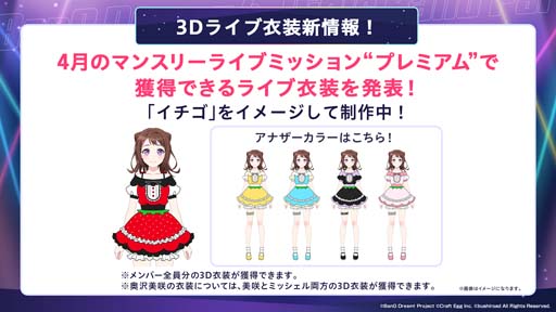4月のマンスリーライブミッションプレミアムの報酬となる3Dライブ衣装は、「イチゴ」をイメージしたデザインとなっております。