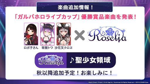 2022年8月28日(日)に配信された「ガルパホロライブカップ in ホロライブサマー」にて、ロボ子さん、常闇トワさん、沙花叉クロヱさんによる「チームハッピー」が優勝し、優勝賞品の「好きなガルパのバンドと歌える権利」としてRoseliaとのカバー楽曲制作が決定いたしました。2023年秋以降に「チームハッピー」とRoseliaが歌う『聖少女領域』を追加いたします。