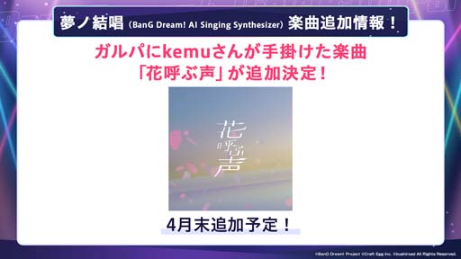 kemuさんが手掛けた夢ノ結唱楽曲『花呼ぶ声』を追加することが決定いたしました。2023年4月末に追加予定です。詳細につきましては、続報をお待ちください。