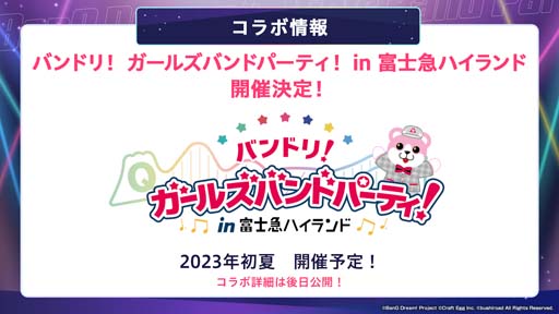 2023年初夏に「バンドリ! ガールズバンドパーティ! in 富士急ハイランド」の開催が決定いたしました。詳細につきましては、続報をお待ちください。
