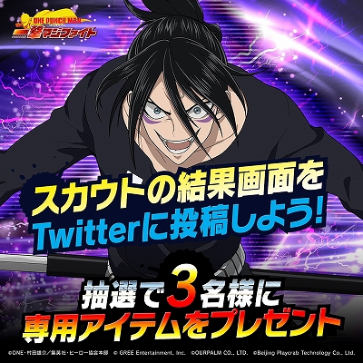 「ONE PUNCH MAN 一撃マジファイト」公式Twitterアカウントをフォローして、スカウト画面のスクリーンショットとハッシュタグ「#無双音速のソニック」をつけてツイートしたフォロワーから、抽選で3名様に専用アイテムをプレゼントします。