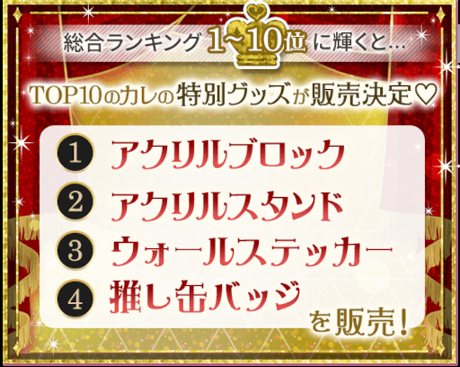 ※TOP10のキャラクター(および殿堂入りキャラの得票数が1位キャラを超えた場合)は該当キャラクターすべてに対して4種類のグッズを制作予定です。
